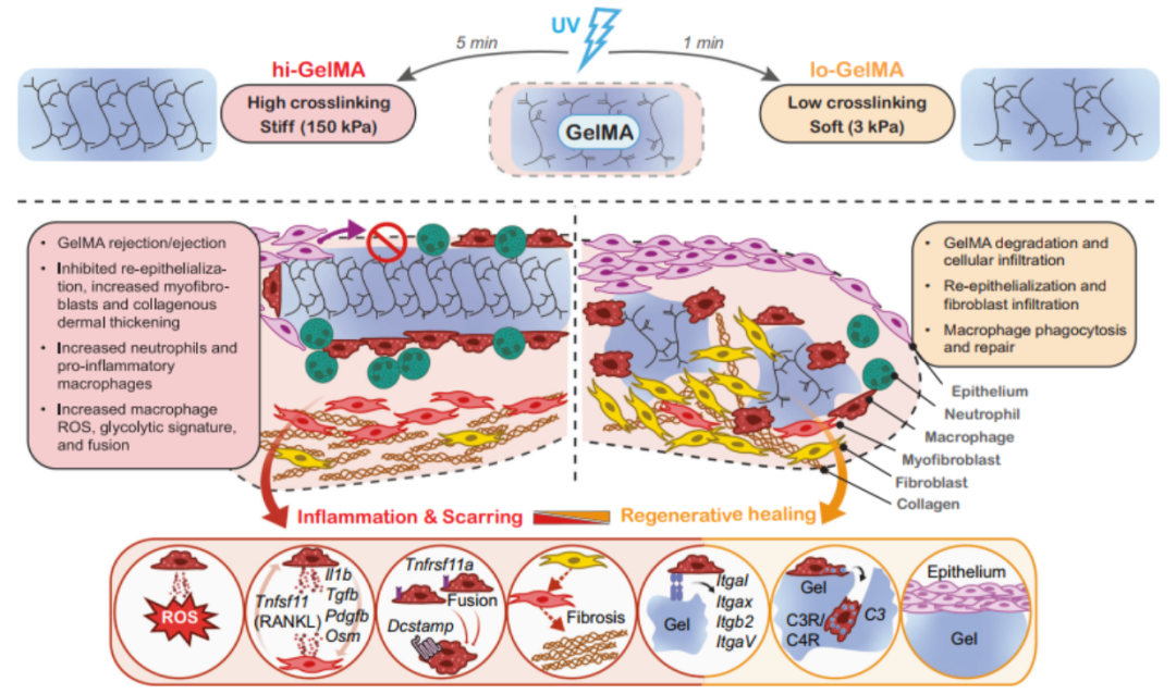 本文使用单细胞RNA测序(scRNA-seq)来研究不同明胶甲基丙烯酸酯(GelMA)交联度对伤口细胞行为的影响。本文将软质、轻度交联的GelMA(lo-GelMA,3 kPa)与硬质、高度交联的GelMA(hi-GelMA,150 kPa)应用于全层小鼠皮肤伤口。组织学和scRNA-seq分析揭示了不同的细胞反应:hi-GelMA诱导了增强的炎症和类似异物的反应,而lo-GelMA促进了细胞整合和生物材料的吞噬清除。在hi-GelMA条件下,Mϕ表型偏向于促炎激活,靠近水凝胶的一个亚群产生了高氧化环境。hi-GelMA伴随的增强炎症表现为促纤维化成纤维细胞活性升高。对伤口转录组的细胞-细胞通信网络分析确定了Mϕ-成纤维细胞双向信号的差异,与lo-GelMA相比,hi-GelMA向促炎和促纤维化激活的转变。这些发现表明水凝胶交联与细胞-材料相互作用之间存在关键联系,强调了在伤口愈合的生物材料设计中理解这些动态的重要性。