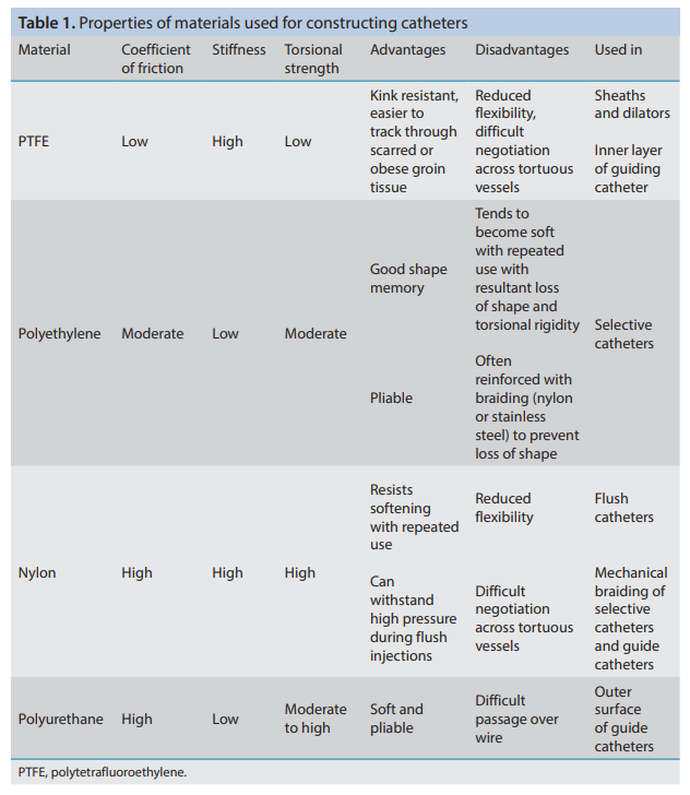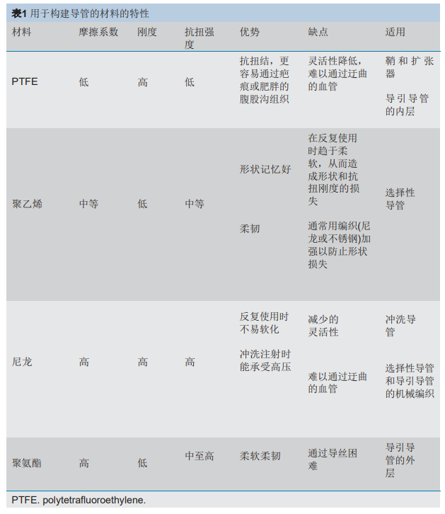i)表面涂层:表面涂层可以改变导管的摩擦系数、促血栓形成性或抗菌性能。ii)外层:血管造影导管可以由聚乙烯、聚氨酯、尼龙、聚四氟乙烯、硅酮、聚氯乙烯或这些材料的组合制成。它们各自的性质、优点和缺点见表1。管腔的摩擦系数对于血管造影时导丝容易通过和获得高造影剂流速很重要。相反,导管外表面的低摩擦系数有助于其可追踪性,尽管这是牺牲注射期间位置稳定性的。材料的刚性使导管能够承受血液长时间施加的压力。