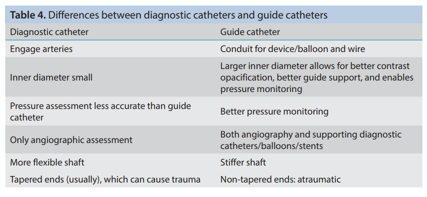 这是一种特殊类型的导管,不向头端逐渐变细,并有一个加强结构。表4总结了导引导管和诊断导管的基本用途和差异。导引导管的直径一般为6-8F,长度为65-100cm。导管的特性由其直径决定。较小的导引导管(如6F)需要较小的穿刺,可以深入动脉;但是,与直径较大的导管相比,它提供的支撑力和扭控较小。它也限制了可以使用的装置/支架的大小。较大的导引导管(7-8F)可提供更多的支撑、扭控和可视化,而且还允许使用较大的器械。然而,这种类型的导管也会导致造影剂的使用增加。使用的导引导管的选择取决于主动脉的大小以及要钩住的血管的位置和开口,例如肾动脉导管、右冠状动脉导管和MP导管(图7)。