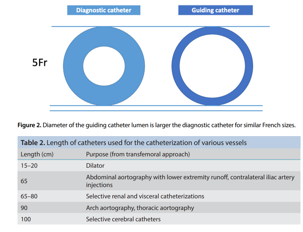 大多数血管造影使用4-F或5-F导管且能兼容0.035或0.038英寸的导丝。所用导管的直径由患者的年龄、血管大小、血流速度以及是否需要选择性或超选择性检查决定。