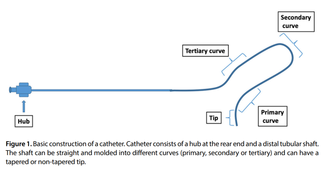 导管是一种可插入管道、体腔或血管的柔性空心管。它由尾部的hub和远端管状体组成。管体可以是直的,也可以成型成不同的弯曲形状(一级、二级或三级弯曲),头端可以是锥形的,也可以是非锥形的(图1)。置管就是插入导管的过程。血管造影导管是任何血管介入治疗中最重要的工具。它们通过放置在血管通路部位的鞘管进入。通过这些导管内的导丝导航下进入目标血管。一旦导管进入血管内,它们可用于对预定血管区域进行诊断性血管造影,并作为导管在预定位置输送用于血管内介入的球囊和支架。