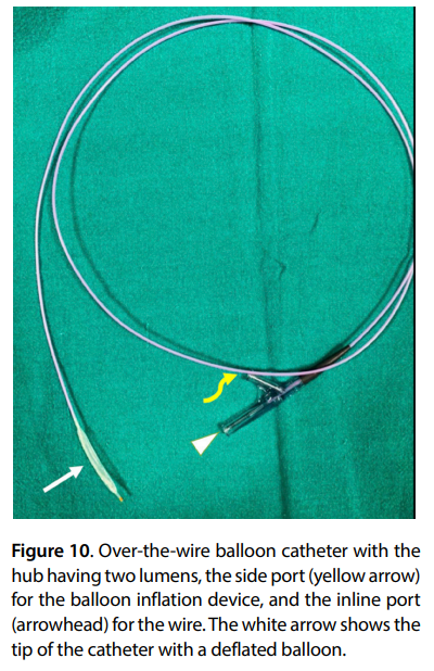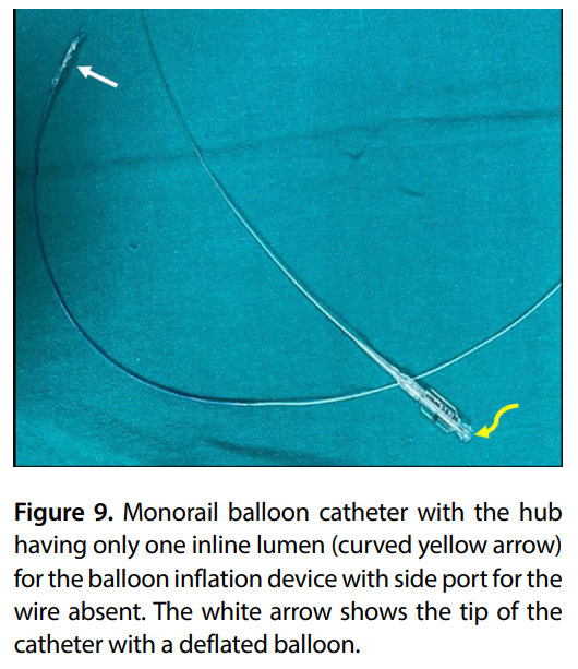 这些软而柔韧的球囊可以用作闭塞球囊或Fogarty球囊(用于取栓),也可以是刚性的用于扩张(血管成形术)。用于扩张的球囊可分为两种主要类型:单轨型(图9)和OTW型(图10),前者有一个单腔,导丝向近端延伸,后者有不同的腔,用于球囊扩张和导丝导入。这些导管有两种特性:额定爆破压力,即达到并包括单次充盈时球囊不会爆炸的压力:公称压力,指的是气球达到其标记直径时的压力。