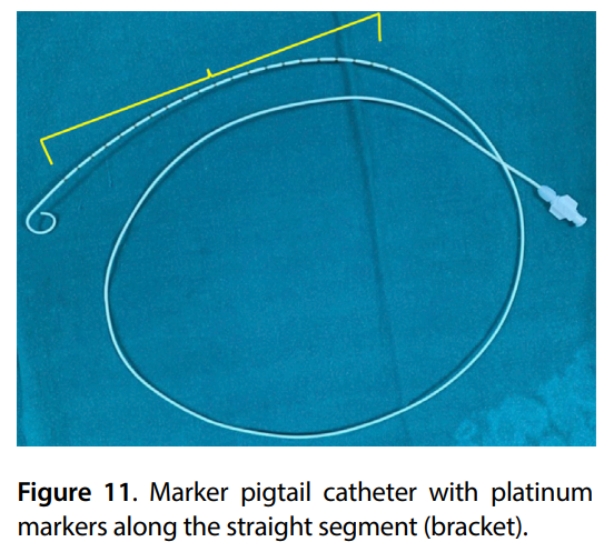 它们被用来精确测量血管段的长度,并且它们的身上有固定间隔的金属标记。例如,在主动脉支架置入前使用标记猪尾巴导管(图11)。