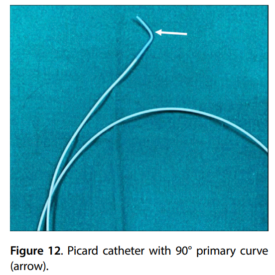 弓部血管插管:I型主动脉弓首选简单弯曲导管;然而,对于II型、III型或牛型主动脉弓,需要复杂的弯曲导管来对特定的分支血管进行插管。根据起始角度不同,可以使用简单的弯曲导管(如Picard导管(90°弯曲)(图12)或复合双弯导管(如Judkin右冠状动脉导管或乳内动脉导管)对乳内动脉进行插管。