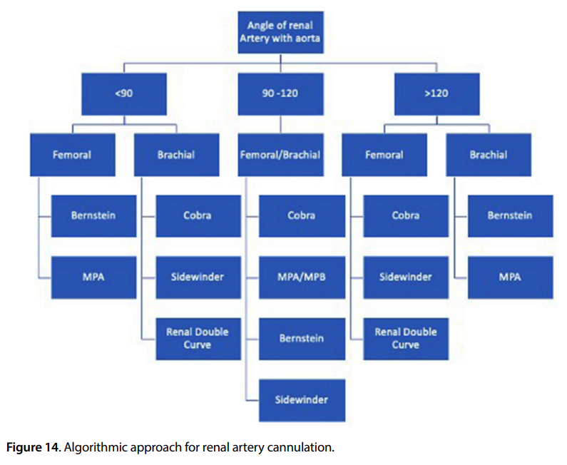 内脏血管置管:Chuang提出了选择性内脏动脉置管的110规则;在目标分支血管水平,规定导管远端头端至一级弯的长度和弯宽应为固有动脉宽度的110%(图13)。图14讨论了根据肾动脉起始的角度使用特定的导管。腹腔动脉、肠系膜上动脉和肠系膜下动脉与主动脉的起始角度通常<90°。可以使用Cobra或RC动脉导管等专门导管选择性地对这些动脉进行插管。