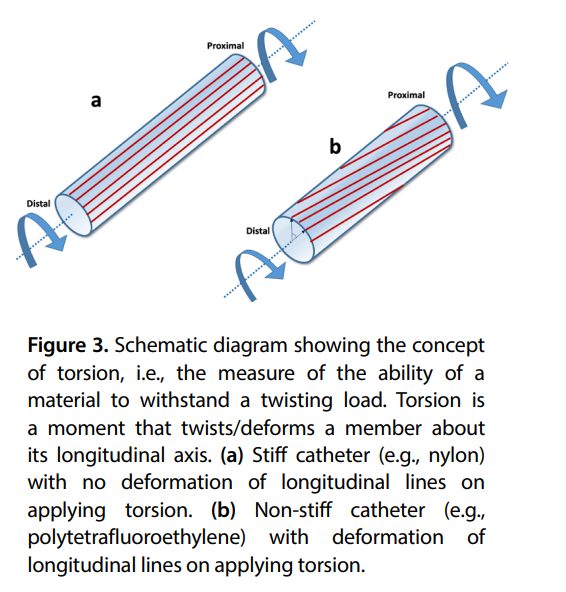 扭转强度指的是通过旋转导管近端使导管远端弯曲向某个方向的能力。这被认为是导管直径的函数,并与外径和内径的四次方之差成正比(图3)。粗略扭转强度也随着导管材料的不同而变化;例如,聚四氟乙烯-聚乙烯-尼龙的扭转强度比值约为1:2:4。丝的加固使扭控稳定性提高了3倍。