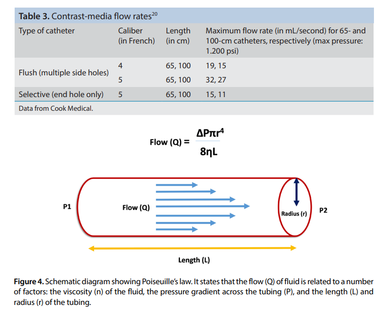 造影剂的流速由制造商指定。它遵循泊肃叶定律,并取决于对比剂的粘度,横跨管体的压力梯度,以及导管的直径和长度(表3)。内径加倍,流量增加16倍,符合泊肃叶定律。导管长度加倍会使造影剂流速降低一半,这与造影剂的黏度成反比(图4)。增加压力可使流量最大化。正因为如此,导管壁的承压能力是一个重要的考虑因素。