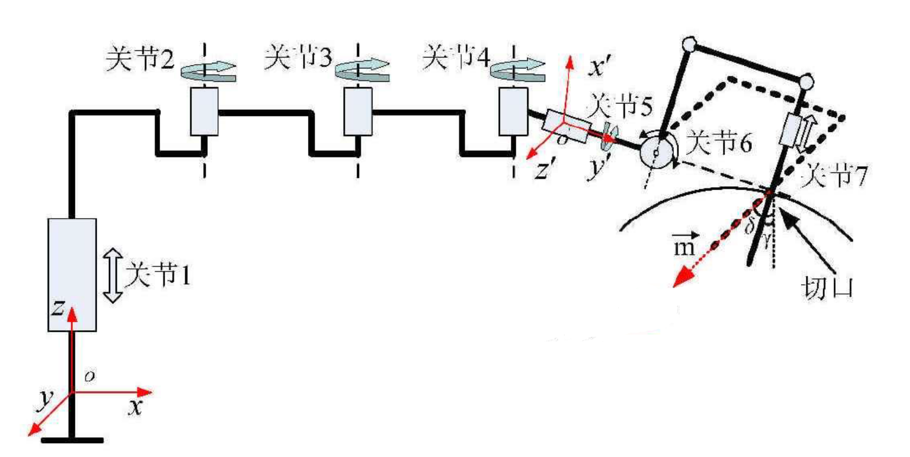 从手机器人机械臂的最终构型如图所示(跟上图中的达芬奇架构不太一样)。机械臂是具有个冗余自由度的七自由度机械臂,由定位关节和远心机构组成,关节1~关节4为定位关节,关节5~关节7组成远心机构,其中关节1和关节7为直线移动关节,其余的几个关节都是转动关节。