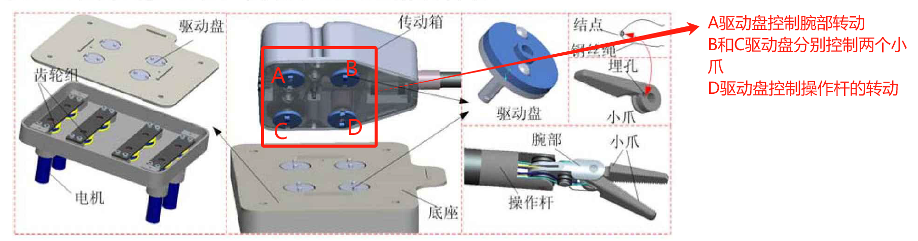 1.电机驱动腕部关节盘时,器械末端只有腕部关节转动(小爪不动)
