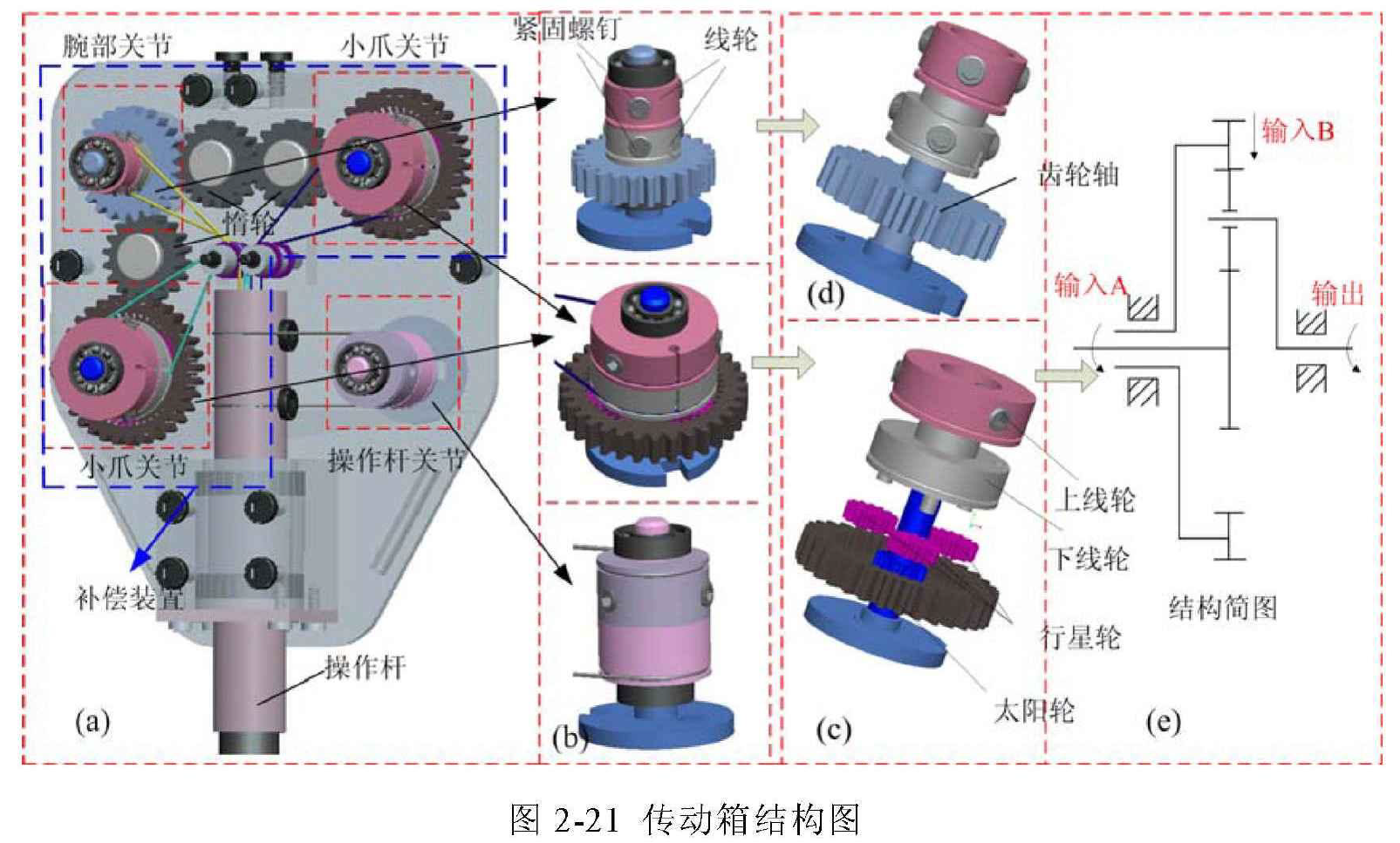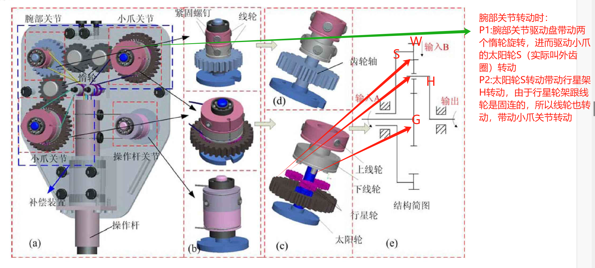 补偿装置由腕部关节和两个小爪关节组成的差动行星齿轮组构成,详细结构如图 2-21(b)(c)(d)所示。差动行星齿轮(如 图2-21(c))由齿轮轴、太阳轮、三个行星轮和下线轮组成,下线轮为三个行星轮的行星架。(注:根据机械设计基础,文章提到的齿轮轴实际上应该叫“太阳轮”,太阳轮实际上叫“外齿圈”)