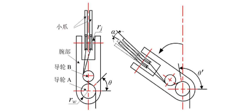 如图所示,腕部的一端安装在操作杆上,可以相对操作杆进行转动,小爪安装在腕部的另一端,并且相对腕部也可进行转动;导轮A和导轮B安装在腕部上,用于对驱动小爪运动的钢丝进行导向,其中导轮A的转动轴线与腕部运动轴线同轴。为了保证钢丝的精确传动,钢丝工作在无滑动传动状态。当腕部由θ运动到θ’时,驱动小爪运动的钢丝在导轮A上的包角发生改变,即缠绕在导轮A上的钢丝绳长会发生改变。又因为钢丝为无滑动传动,则腕部的运动势必会给小爪带来一个耦合运动。