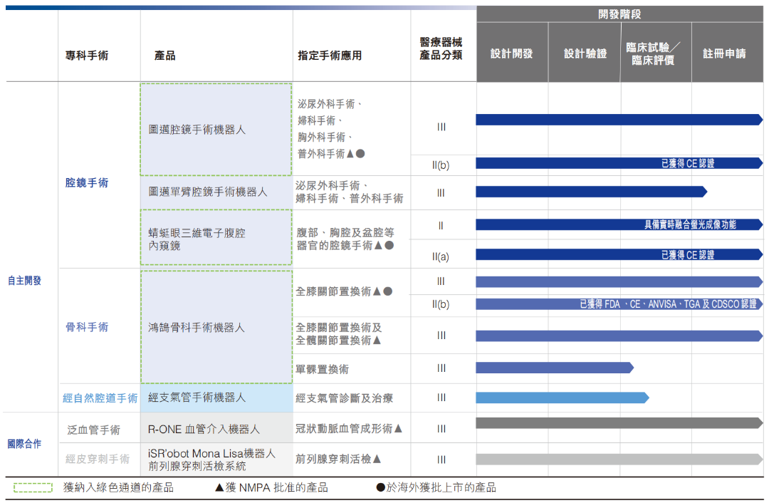 鸿鹄骨科手术机器人于2023年获得NMPA颁发的上市注册证,并拿到FDA的510 (k)认证、欧盟CE认证、巴西ANVISA、澳大利亚TGA以及印度CDSCO的认证,是首款及唯一一款同时于中国、美国、欧 洲、巴西、澳大利亚及印度等手术机器人主要市场获批上市的国产手术机器人。
