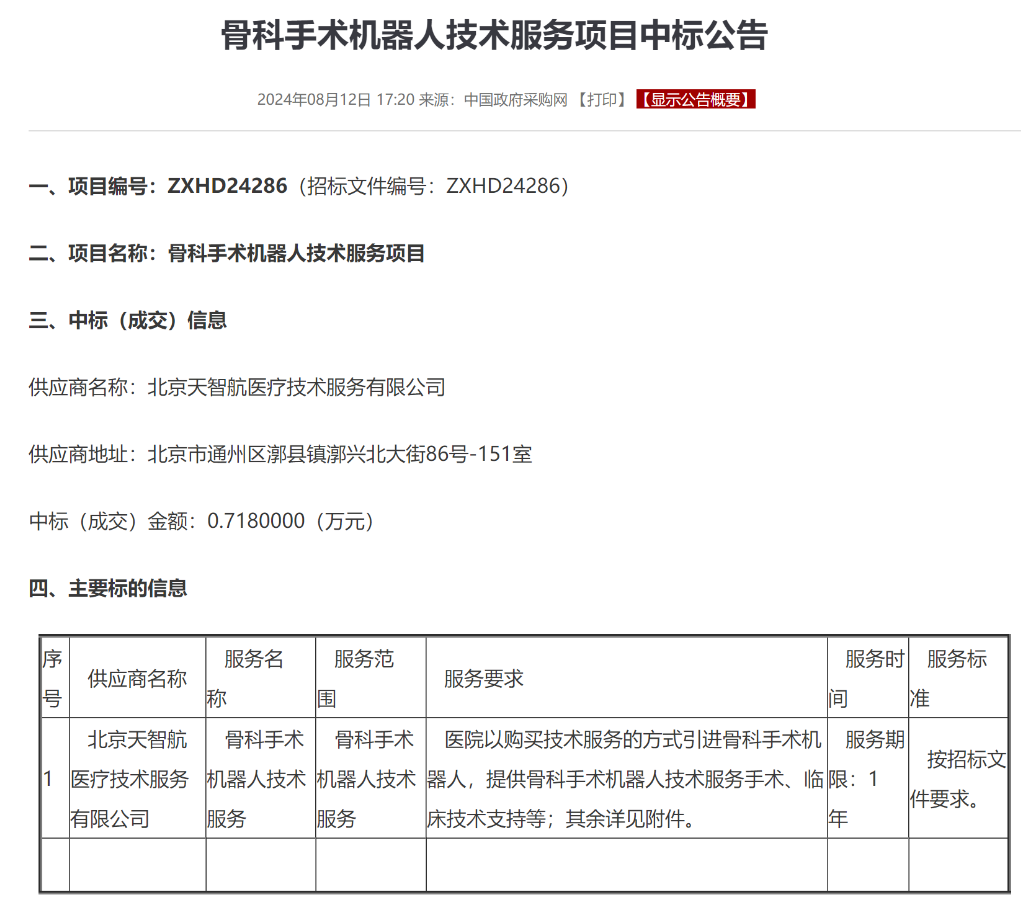 今年8月中旬,中国政府采购网发布的一则中标公告曾引发行业关注,公告显示,天智航中标骨科手术机器人技术服务项目,每台次技术服务费单价为7180元。