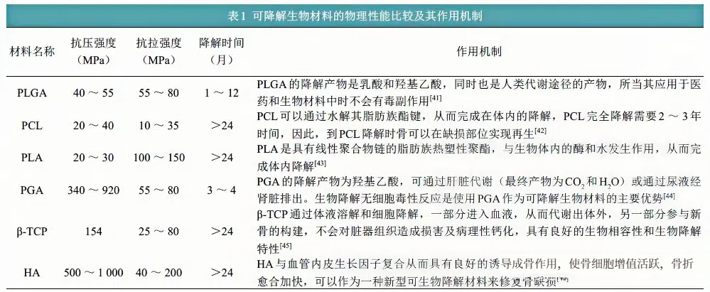可降解材料虽然具有诸多优势,但也存在很多缺陷,如PLGA的骨传导性和疏水性较差,在骨修复的应用中存在限制、PCL的降解速度较慢、PLA的力学性能较差、β-TCP的机械强度略低、HA的生物降解速率相对较慢等,这些问题可能对感染性骨缺损修复产生负面影响。如何优化上述可生物降解材料的缺点,使其更好地释放抗生素、促进成骨细胞的生成,是目前骨组织工程学需要解决的问题。对于可降解生物材料的使用,除了需要长期严格的实验来验证其安全性外,还需要精确控制降解速率,使其与骨组织再生速率相匹配。