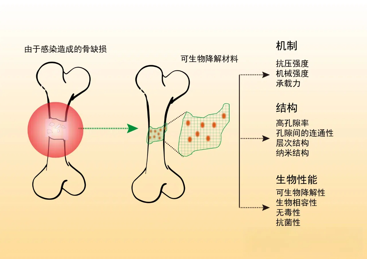 可降解生物材料可以作为一个平台来设计或定制治疗感染的复合支架。由于可降解生物材料具有合适的机械强度、可控的降解性能和良好的生物相容性,所以可用于治疗特定的感染性骨缺损。在复合支架制备过程中主要考虑控制孔径和孔隙率,加入抗生素的目的是在不牺牲生物相容性的情况下提高复合支架的抗菌性能,同时保持最佳的孔隙率,以提供足够的机械强度和降解性能,还可以最大限度地减少抗生素的过度使用。