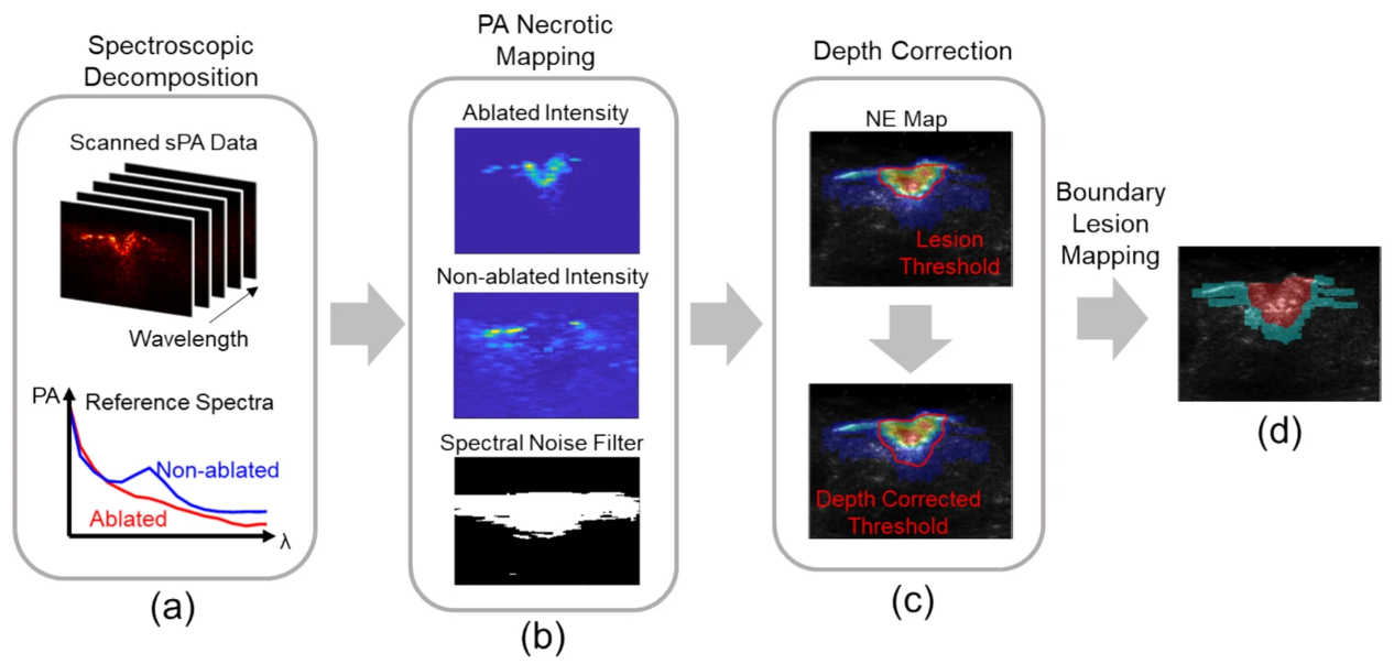 研究团队使用了一种称为“光谱光声成像”(Spectroscopic Photoacoustic, sPA)的技术来检测射频消融损伤。他们通过调整回归模型来提高边界检测的准确性,并通过与临床使用的监测参数进行交叉验证。