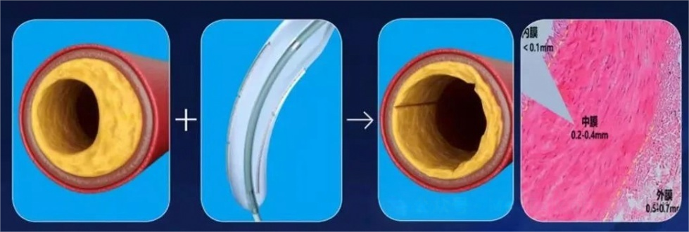 为了能够很好的将硬质钙化斑块切开,切割刀片通常需要具备高硬度、高强度和高耐磨性,因此切割刀片通常由高强度不锈钢或特殊合金制成(如304/304L不锈钢等),其具有极高的硬度和耐腐蚀性;刀片越硬其切割能力越强,越细其切割压强越大(在球囊扩张过程中,刀片对内膜的切割压强是球囊表面压强的30000倍),对各种狭窄可谓是无坚不摧,而且由于不锈钢刀片厚度极薄,只是切开血管壁的内膜,在血管内壁上刻出一道痕迹,并不会割裂整个血管壁,正是这道刻痕是切割球囊特殊扩张机制的关键;