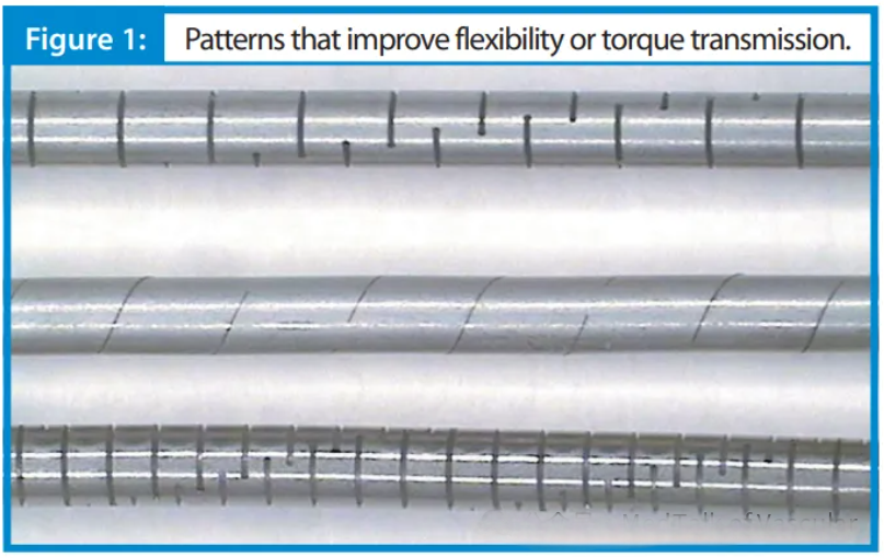 海波管的基材常用医用级的不锈钢,牌号如:304、304L、304V等,并在不锈钢表面涂覆有一层厚度很薄的PTFE涂层(一般为5μm~15μm),以降低海波管在血管中输送的摩擦阻力;海波管的远端切割设计常常有如下图2中的几种方式。