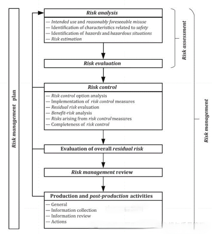 -通过对取自人体的样本进行体外检查的方式来提供信息。其作用于人体体内或体表,主要预期功能不是通过药理学、免疫学或代谢的方式实现,但这些方式有助于实现预期功能。附录2,医疗器械有关的法规要求和标准;医疗器械的输入包括了适用的法规要求和标准,这些要求和标准确保医疗器械的安全性、有效性和质量可控性。以下是一些关键的法规要求和标准:《医疗器械监督管理条例》,这是中国医疗器械监管的主要法规,规定了医疗器械的注册、生产、经营、使用和监督管理的基本要求。《医疗器械注册管理办法》,详细规定了医疗器械注册的申请、受理、技术审评、审批等流程,确保注册过程的规范性和透明度。《医疗器械生产监督管理办法》,针对医疗器械生产企业的监管,规定了生产企业的质量管理体系、生产过程控制、委托生产管理等要求。《医疗器械经营监督管理办法》,涉及医疗器械经营企业的监管,包括经营许可、采购、储存、运输、销售等环节的管理。《ISO 13485》,国际标准化组织发布的医疗器械质量管理体系标准,用于指导医疗器械行业建立质量管理体系3。《CE标志》,欧洲共同体要求的产品合格标志,表示产品符合欧盟相关法规和标准的要求。《IEC 62304》国际电工委员会发布的医疗器械软件生命周期标准,规定了医疗器械软件的开发、验证、验证和维护要求3。《IEC 60601》国际电工委员会发布的医疗电气设备标准,规定了医疗电气设备的设计、验证和验证要求。《ISO 14971》国际标准化组织发布的医疗器械风险管理标准,提供了医疗器械风险管理的原则和方法。这些法规和标准共同构成了医疗器械输入的基础,确保医疗器械从设计、生产、经营到使用的全过程都符合规定的要求,从而保障了患者的安全和健康。附录 3, 风险管理流程图,ISO14971:2019附录 4, “适当时”、“不适用”、“删减”进一步说明如果标准条款里提到“适当时”,那么“适当时”后面的话通常都适用。“不适用”是针对标准的第6、7、8条款,与组织承担的角色、进行的活动、生产的医疗器械产品有关系,例如,组织的产品是便携式电子血压计,条款7.5.5 无菌产品特殊要求,条款7.5.7 灭菌和无菌屏障系统的特殊要求就属于不适用,因为组织没有此类活动。若标准的条款要求不适用,那必须满足5个条件,第一,不会影响产品满足要求,第二,符合适用的法规要求,第三,组织实施了纠正措施,第四,组织对风险进行了管理,第五,要有合理理由。“删减”只是针对条款7.3设计和开发的,组织能否删减条款7.3设计和开发,跟组织是否存在设计和开发活动没有关系,而是与相关的医疗器械法规有关。举个例子,某组织的设计和开发活动是在总部美国进行的,组织只是设在中国的制造工厂,那么是否能删减设计和开发是由组织的医疗器械产品制造销售国家或地区的相关法规决定的。另外,对于经营性企业,法规通常没有此类规定,经营性企业自行决定是否删减条款7.3;对制造型企业,如果是做原材料、半成品的,法规没有要求,企业同样自行决定是否删除条款7.3,如果是医疗器械成品型企业,需要依据所在生产销售国家的法规对成品医疗器械的要求来确定是否能删减条款7.3,例如在中国销售的2类、3类医疗成品器械,其设计和开发是不可以删除的。成品医疗器械制造组织可能没有产品设计和开发,但它必然有过程的设计和开发,而过程的设计和开发的输入来自产品的设计和开发输出,因此该组织必然有产品设计和开发过程的输出。附录5,英文条款7.3.3 Design and development inputsInputs relating to product requirements shall be determined and records maintained (see 4.2.5). These inputs shall include:a) functional, performance, usability and safety requirements, according to the intended use;b) applicable regulatory requirements and standards;c) applicable output(s) of risk management;d) as appropriate, information derived from previous similar designs;e) other requirements essential for design and development of the product and processes.These inputs shall be reviewed for adequacy and approved.Requirements shall be complete, unambiguous, able to be verified or validated, and not in conflict with each other.NOTE Further information can be found in IEC 62366–1.文章来源: 医用器械生产合规与质量管理
