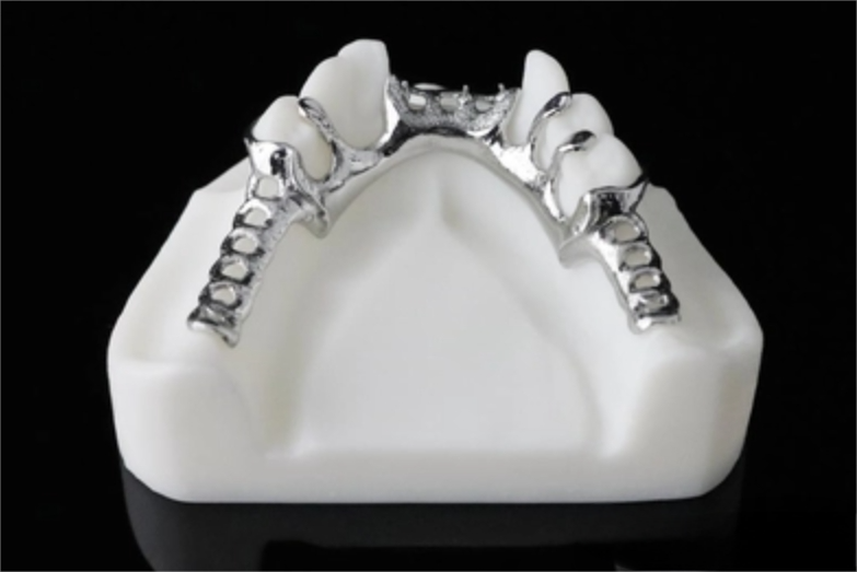 用于齿科3D打印的合金金属包括钛(Ti)和钴铬 (Co-Cr),合金的机械性能是许多牙科应用的理想选择。基于3D打印的合金与传统铸造方法相比,其具备较优的机械力学性能,但需要改进3D打印金属和陶瓷的配合界面,以匹配使用传统铸造方法获得的精度。与传统铸造方法相比,3D打印的钴铬合金的硬度值更高(371±10HV),精度和一致性更高,且贴合更佳。