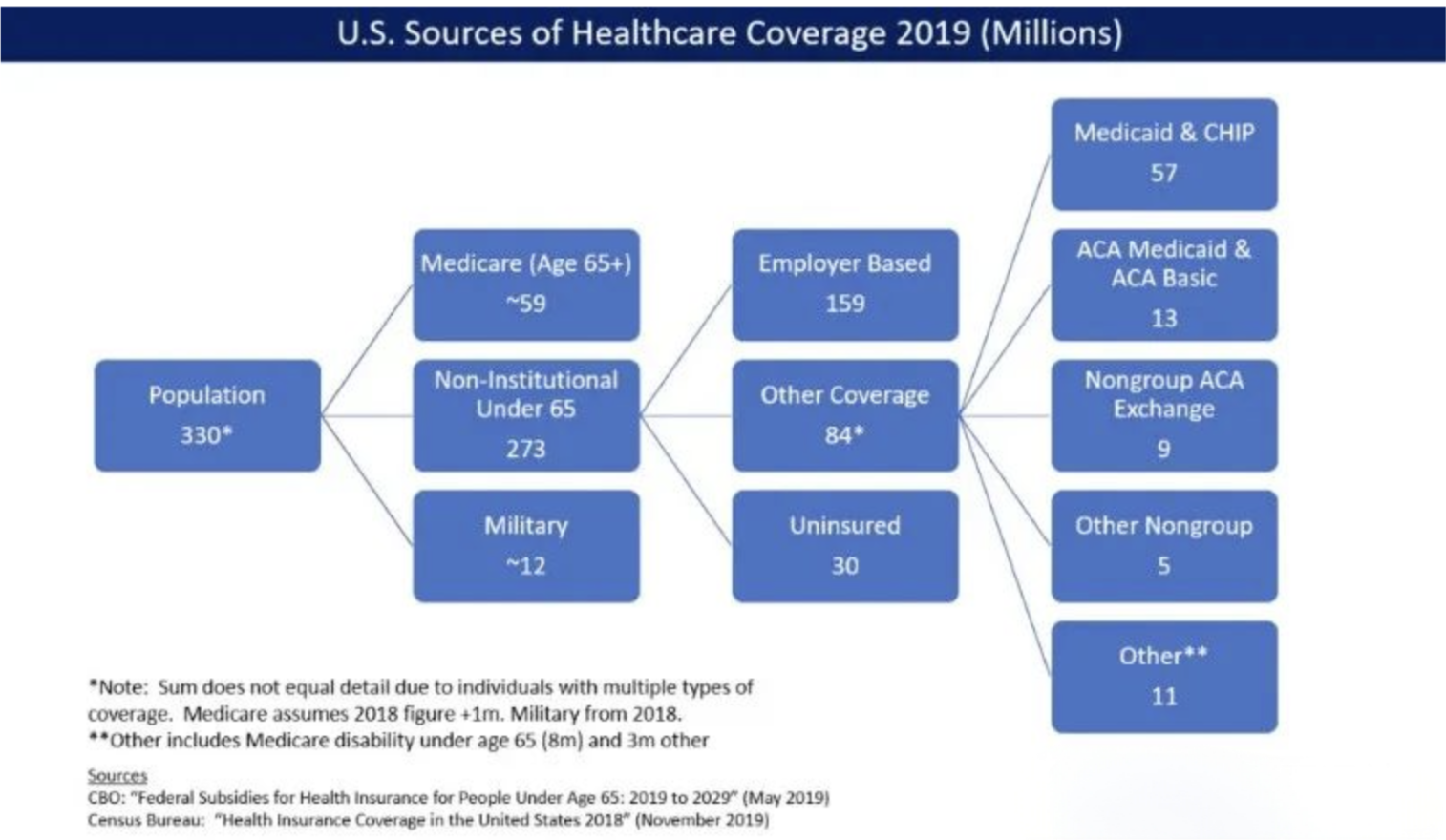 美国医疗保险体系的覆盖,由政府公共支出和私人商业保险来源共同提供,包括Medicare、Mediaid、和医疗保险市集等。在2016年,在ACA法案实施6年后,据统计,有91.2%的美国人拥有医疗保险。