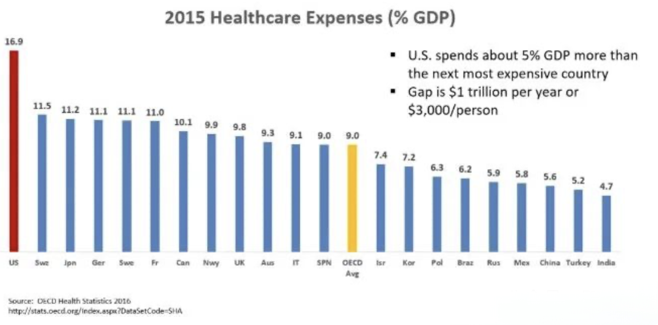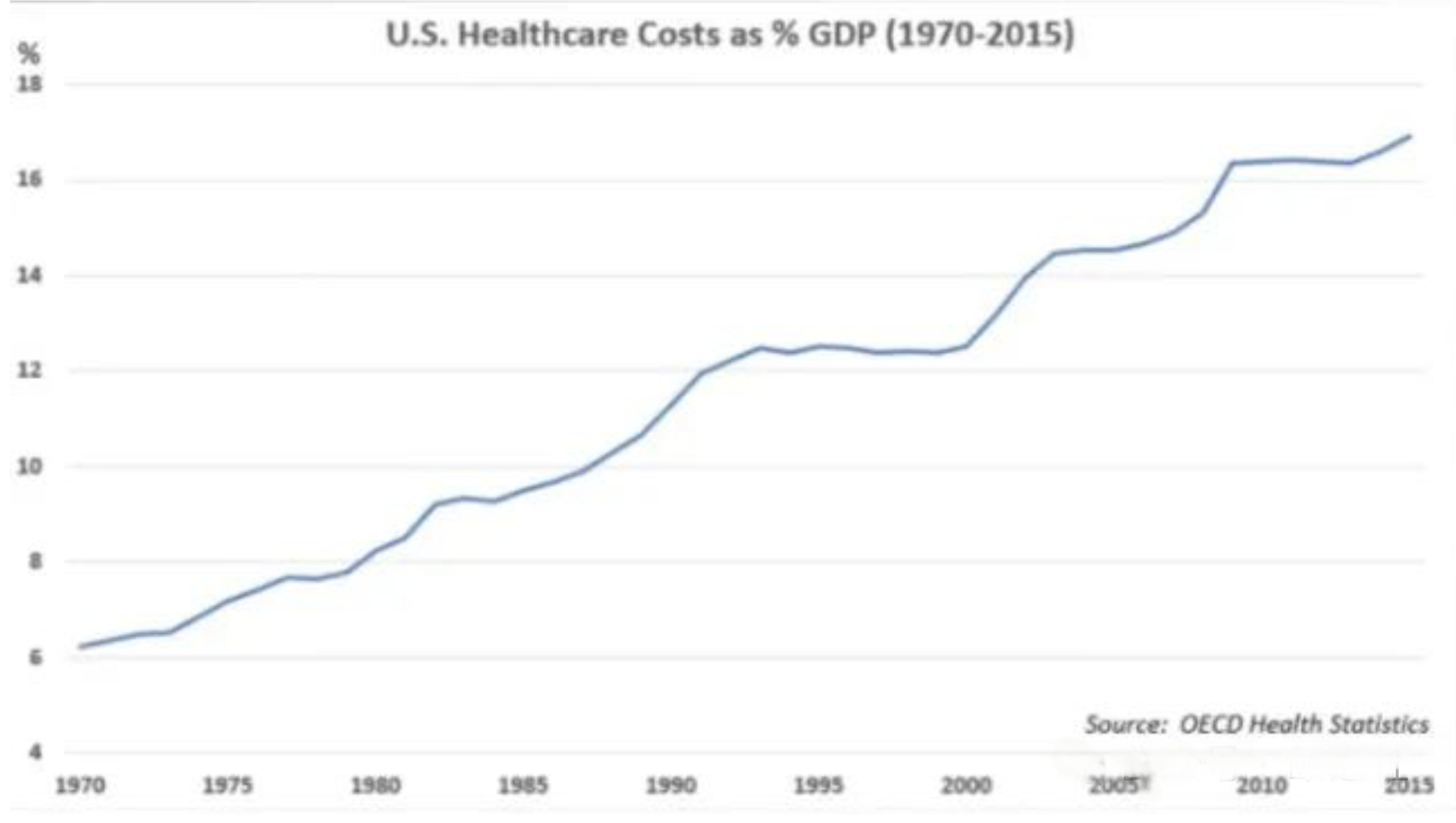 根据OECD资料,2015年美国医疗卫生费用为GDP的16.9%,比第二高的OECD国家(由较高收入的38个发达国家组成的经济合作与发展组织)高出5%。