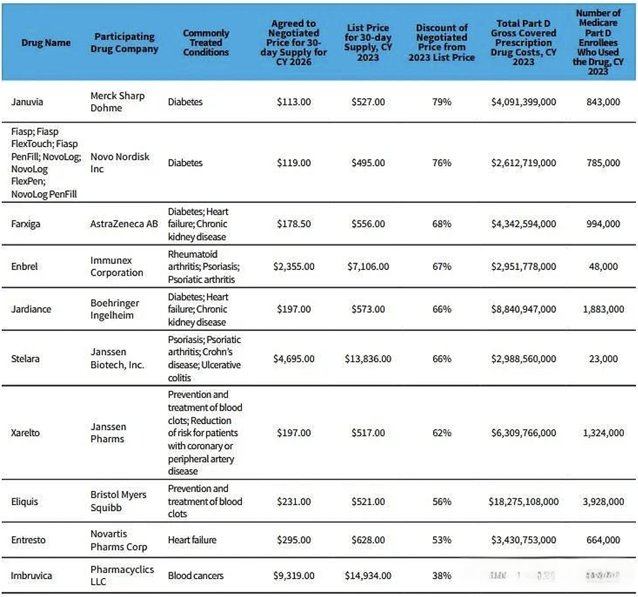 2022年美国Medicare保险体系谈判首批10款畅销药价格情况,数据来源:CMS