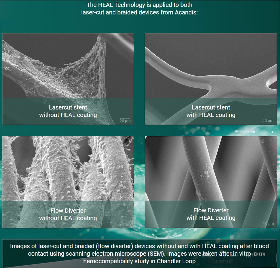 Derivo栓塞装置(DED,Acandis)于2016年推出,采用24根镍钛合金丝,带有放射性不透明的铂芯环。该装置经过50纳米氧化钛表面处理(涂层),理论上可降低输送和打开过程中的摩擦并最终减少血栓形成。Taschner及其同事报告,在一项包含119名患者的前瞻性多中心研究中,主要发病率(改良Rankin量表大于3分)为3.1%,主要卒中率为4%[12]。在1年时89%的患者实现了动脉瘤闭塞。在巴西的多中心BRAIDED试验中,报告的“重大不良事件”率为5.5%,同样在1年时血管造影闭塞率为89%,长期结果数据尚待公布。Derivo的涂层是用了Acandis公司的“HEAL Technology”。“HEAL Technology”模拟了自然止血的最后一步,即通过凝血酶将纤维蛋白原转化为纤维蛋白。其受控的生长过程产生了一个薄且完全聚合的纤维蛋白网络,并额外共价结合了肝素分子。这种HEAL涂层的成分赋予了抗血栓性和促进内皮化的特性,这对于颅内装置的快速愈合至关重要。纤维蛋白对表面进行钝化,使植入物不会被视为异物,因此不会触发炎症或凝血过程。钝化作用显著降低了血栓形成的可能性。同时,纤维蛋白网络为周围的内皮细胞形成了理想的支架,从而支持内皮化并促进植入物在血管中的愈合。