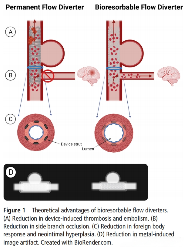 2024有源医疗器械创新论坛在前面提到过“鸟尽弓藏”是治疗过程中的一个理想状态,生物可吸收的血流导向装置(BIORESORBABLE FLOW DIVERTERS,BRFDs)正在慢慢进入大家的视野。理想的BRFD在闭塞和修复动脉瘤后可被人体无害吸收,从而消除当前支架永久存在所带来的并发症风险。尽管BRFDs的概念相对较新,但生物可吸收的冠状动脉支架已经进行了广泛研究,并有多种设备迭代和材料进入临床。这些研究的成果可以用于BRFDs的设计,并展现出生物吸收血管内设备的一些优势。与传统的永久性FD相比,BRFDs的潜在优势包括:
