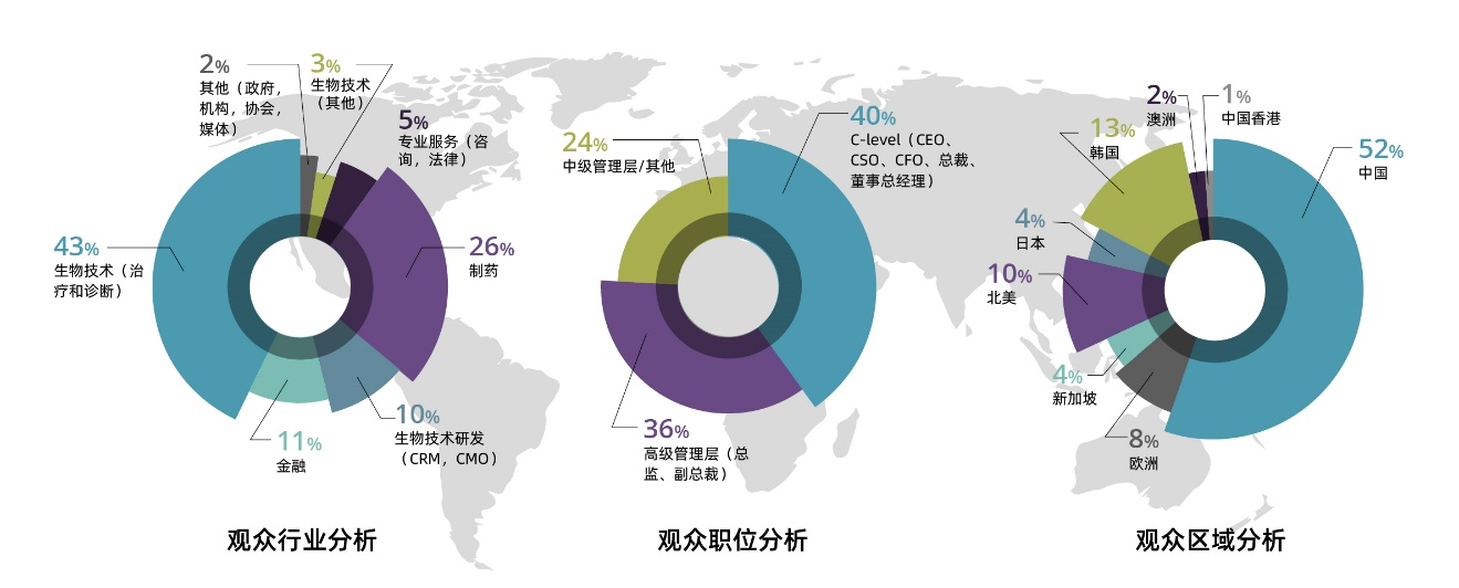 依托国际领先的partneringONE™ 合作系统,参会代表可以在会前浏览其他参会代表的个人资料和项目信息,向潜在合作伙伴发送会议邀请并安排现场见面。根据大会以往数据,76%的参会代表是企业C-Level以及高级管理层,其中60%以上来自生物技术行业,26%来自制药行业。大会现场将安排超过2500场一对一会议,为参会代表提供与企业决策者深入沟通合作的机会,带来全新的且高效的合作体验。
