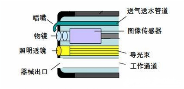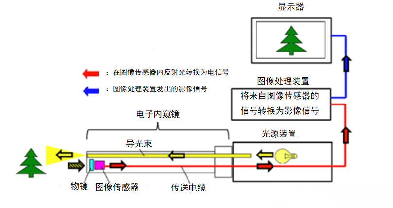 2025上海医疗器械创新展指出,电子内窥镜由照明传输模块和图像传送模块构成,其纵截面图见图1。照明传输模块指从光源装置输出的光经由导光束加以传导,通过头端部的照明透镜照射;图像传送模块通过图像传感器,从物镜入射的来自被摄物的光被转换为电气信号,图像处理装置将电气信号转换为影像信号。