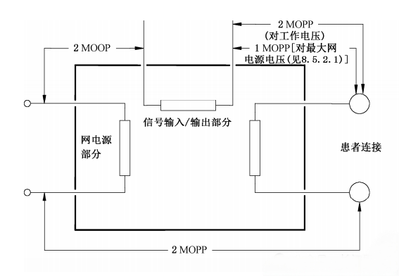 同时这也回答了最开始的问题,在示例1中,带电内窥镜的结构2作为F型应用部分的一部分,其相关绝缘路径是对患者的防护,故路径9与初级应是2MOPP而不是2MOOP;示例2中在经过路径11的防护后,路径9次级电路与初级之间防护可视为操作者防护,即2MOOP。