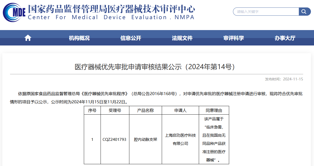 近日,国家药监局器审中心发布医疗器械优先审批申请审核结果公示(2024年第14号),上海启功医疗科技有限公司(简称:启功医疗)的腔内动脉支架通过优先审批绿色通道。