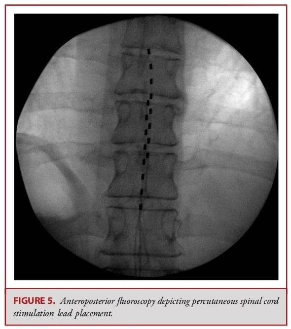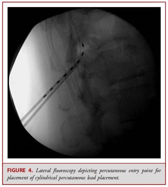 ● 经皮电极通常由 8 个球形接触点组成,而鳍状电极则通常具有16至20个接触点,且所有接触点都平铺在硬膜表面(见图 1-3)。经皮电极通常通过改良版的 Tuohy 导管进行插入(见图 4)。在使用失去阻力法进入硬膜外腔后,电极在透视引导下被推进至与疼痛部位相应的脊髓节段(见图 5)。经皮电极和鳍状电极在镇痛效果上具有相似的疗效。经皮电极植入属于较低侵入性的手术,术后并发症的发生率较低(2.2%,相较于鳍状电极3.4%),因此对于合并症较多的患者来说,是一种更为理想的选择。鳍状电极虽然更具侵入性,但与圆柱形经皮电极相比,电极移位的发生频率较低。由于鳍状电极具有更多接触点,因此可以实现更为精准和高效的刺激。