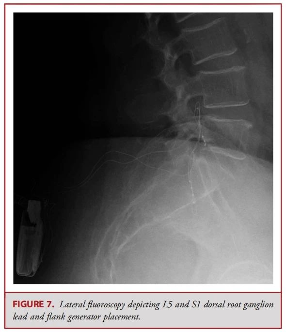 ● 背根神经节(DRG)刺激器导线的置入传统上可通过对侧的旁中线途径。此时,Tuohy针穿刺点位于椎体旁,距离目标椎孔约2个椎体水平。使用失去阻力法将针头推进至接近中线的尾端椎板间隙。一旦进入硬膜外腔,导管鞘会被调整方向,使其指向目标椎孔,并缓慢推进。接着插入导丝,然后插入导线;使用透视法确认导线位置。最后,在硬膜外腔内形成一个应变缓解的“S”形环,并将导线固定在深筋膜上(见图 2、6 和 7)。