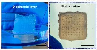 具体而言,他们将喷嘴排列成四乘四的阵列,能够一次性拾取16个球状体并迅速准确地放置在生物墨水基底上。此外,喷嘴阵列还可以根据定制模式拾取球状体,从而创建出具有特定结构的复杂组织。
