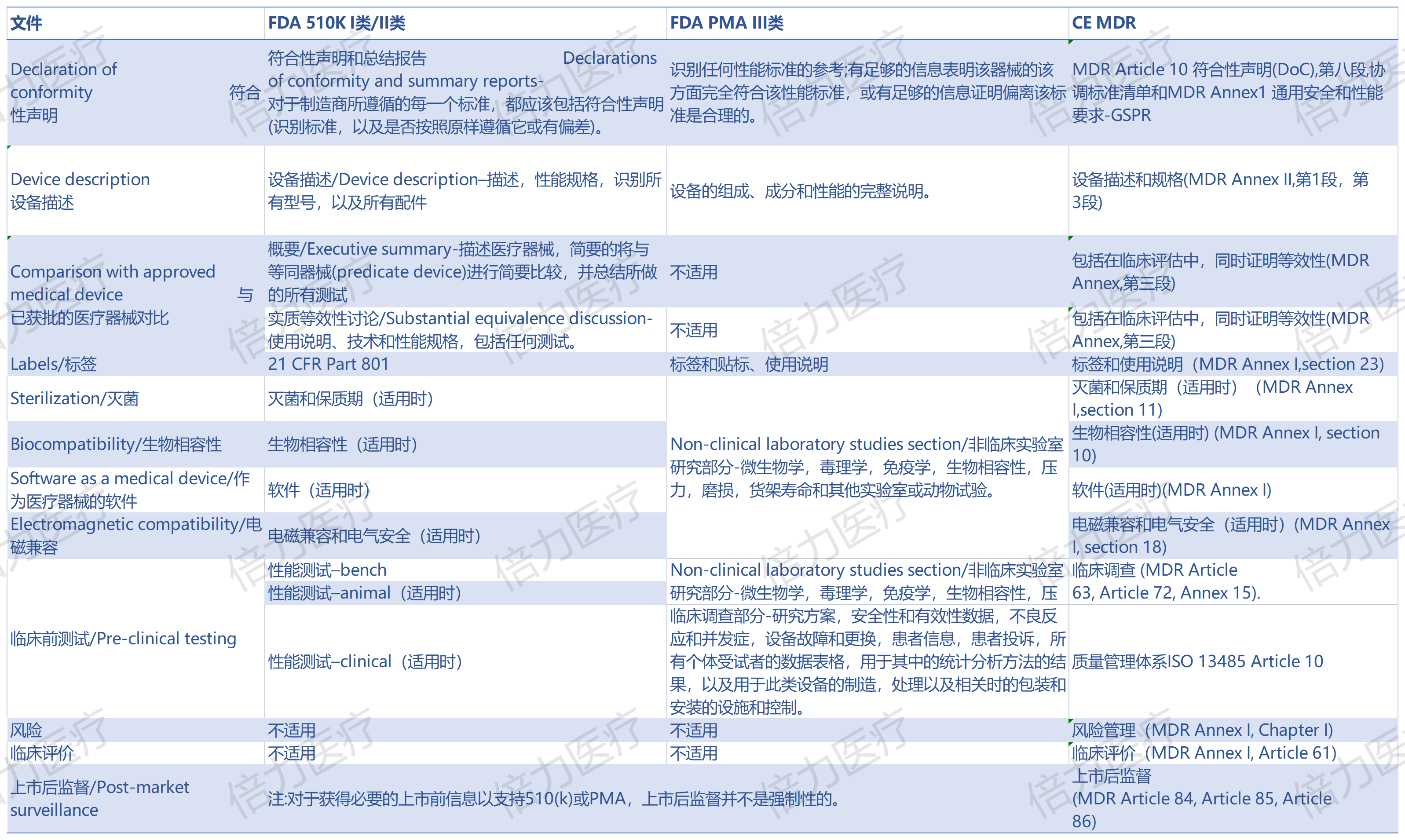 注:本表只考虑与医疗器械直接相关的文件,不包括申请 FDA 和公告机构所需的任何行政文件。