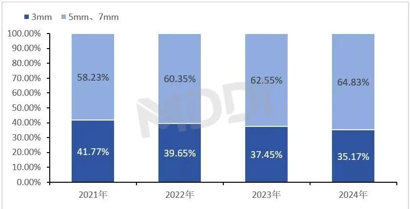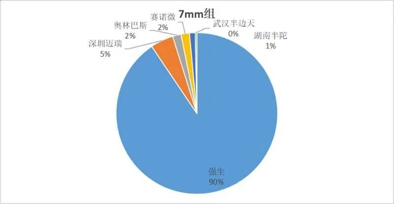 据医装数胜统计,我国超声刀头需求量日益增加,在各省、联盟持续开展超声刀头集采背景下,我国超声刀头市场渗透率快速提升,预计到2025年将首次突破10%,到2028年达到24.39%。目前国内主要以3mm和5mm为主,7mm产品获批市场份额相对较小。从整体趋势来看,我国3mm小口径血管封闭的超声刀头市场份额逐年下降,5mm以上的市场份额增长迅速,随着临床对产品适用范围的要求不断提高,7mm血管封闭的超声刀市场有望迅速提升。