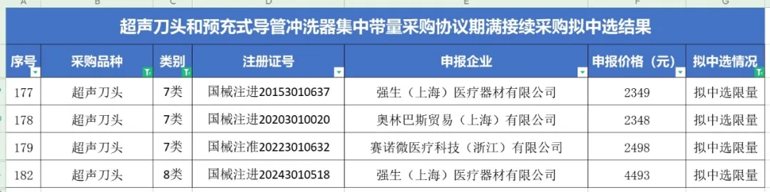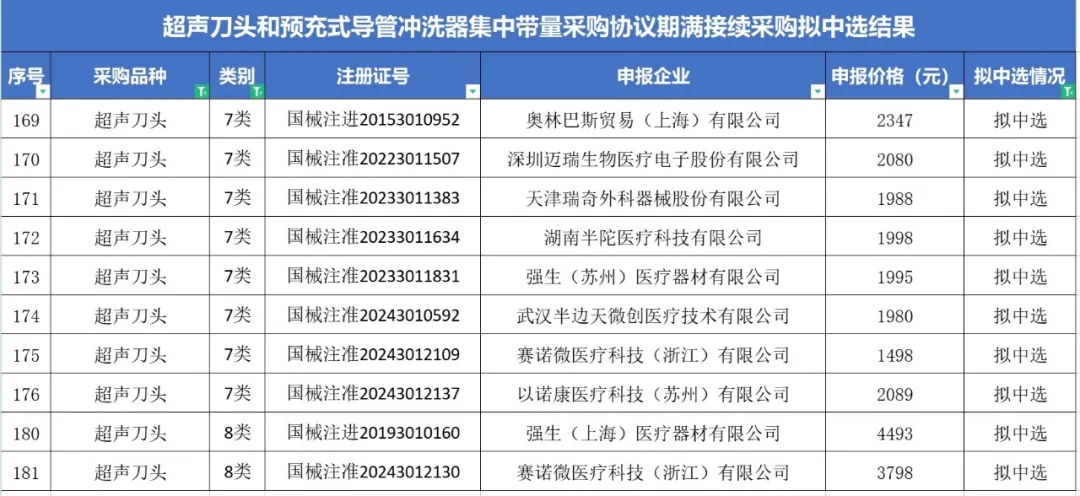 本次拟中选名单显示,一次性使用超声刀头(闭合血管直径≤7mm)拟中选产品:9家