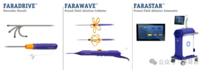 FARAPULSE的核心导管FARAWAVE采用独特的“花瓣-网篮”形态设计,5个花瓣各含4个电极,通过手柄滑块可切换为平面花瓣或立体网篮形态,最大直径达35mm,适配不同肺静脉解剖结构。配套的FARADRIVE鞘管(13Fr)支持灵活导航,提升贴靠稳定性。