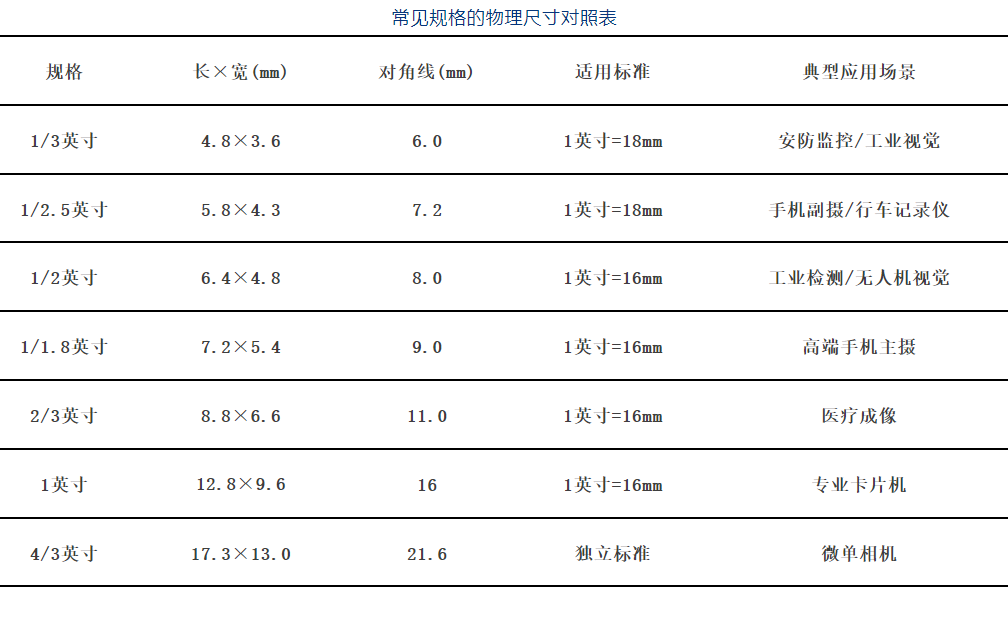 传感器尺寸通常以对角线长度表示,遵循行业通用换算标准 。以下为常见规格的物理尺寸对照表: