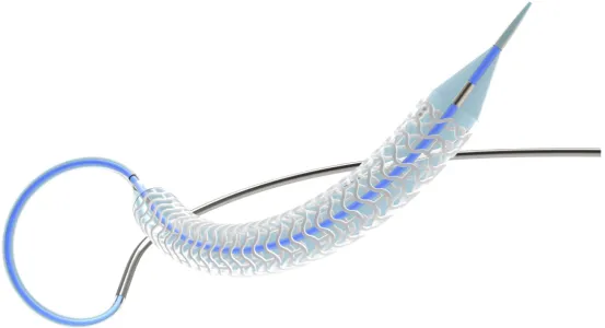 Absorb BVS 支架是由可扩张的球囊、PLLA 支架(支架厚度≈150µm)和 D,L 乳酸涂层(≈7µm)构成。该涂层拥有类似于金属药物洗脱支架的洗脱系统,可以释放依维莫司。支架的两端有金属铂标记,可以使支架在影像学中显示。
