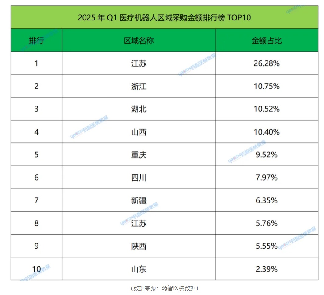 在2025年Q1医疗机器人市场中,采购份额最大的区域是江苏,浙江、湖北、山西、重庆位居前五名,前五区域采购总额占到了全国的67.47%。