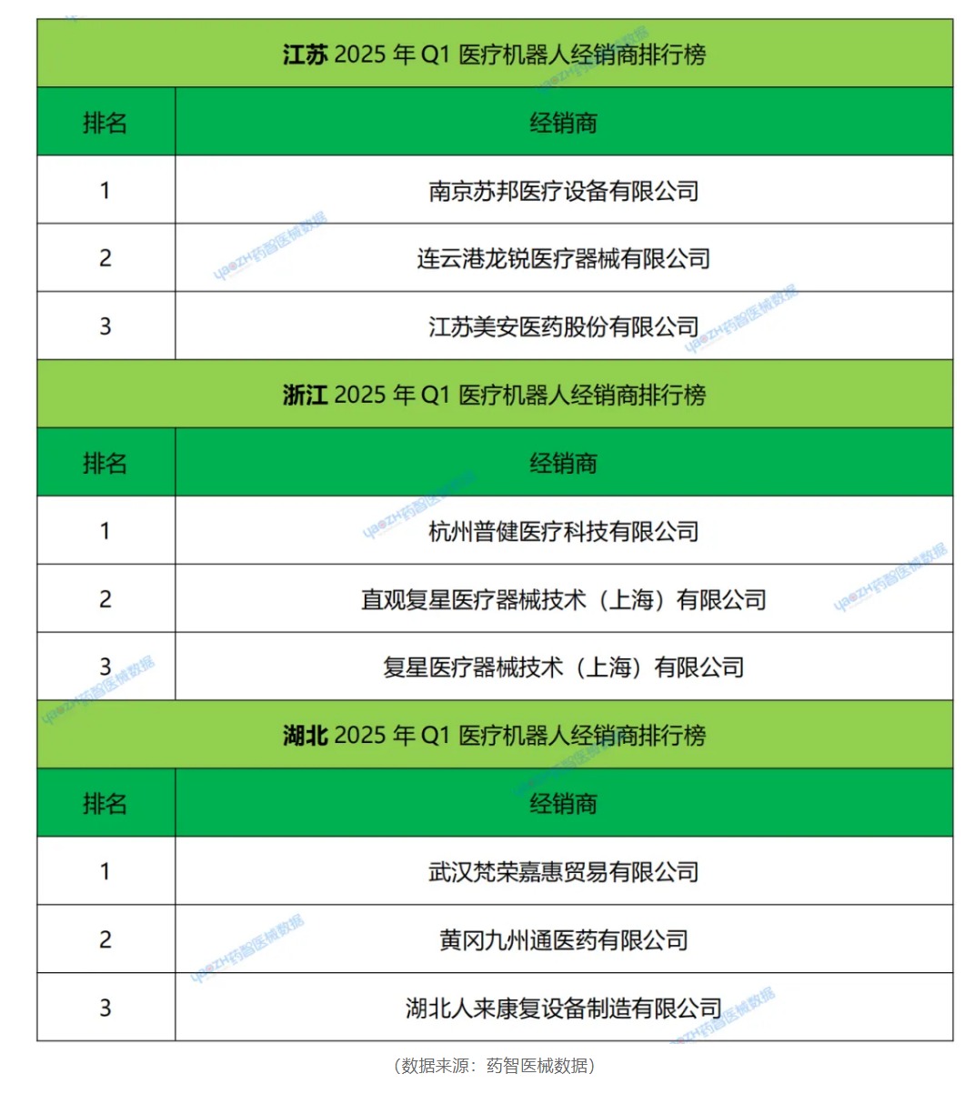 南京苏邦医疗设备有限公司、连云港龙锐医疗器械有限公司,江苏美安医药股份有限公司为江苏区域医疗机器人的主要供应商;杭州普健医疗科技有限公司,直观复星医疗器械技术(上海)有限公司、复星医疗器械技术(上海)有限公司为浙江区域医疗机器人供应商的前三名;武汉梵荣嘉惠贸易有限公司,黄冈九州通医药有限公司,湖北人来康复设备制造有限公司为湖北区域医疗机器人供应商的前三名。