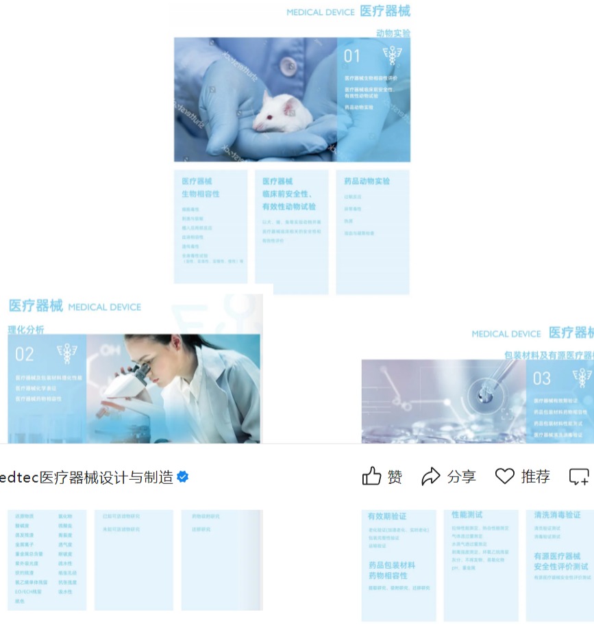 微谱在医疗器械领域致力于构建一个医疗器械全生命周期创新服务平台,为医疗器械设计开发、非临床研究等提供高效合规的测试、评价服务,助力医疗器械创新研发与全球申报。我们拥有一支由材料学家、化学家、生物学家、毒理学家、临床专家等组成的专家队伍,为医械厂商提供原材料筛选与控制、过程验证、生物学评价、药物相容性研究、体外降解试验、药物定性定量与释放研究、临床评价等服务,与我们持续合作的医疗器械企业已超过1500家,涵盖骨科植入、心血管植介入、神经介入、有源植入美容整形植入、药械组合、辅助生殖耗材等植入器械,我们的报告和服务得到了中国、欧盟、美国等国际主要市场监管机构的认可。
