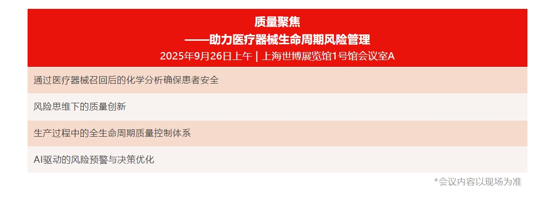 除了丰富的产品展示,主办方还将举办同期Medtec国际医疗器械供应链生态峰会:质量聚焦-—助力医疗器械生命周期风险管理。会议将聚焦“风险识别-控制-监测”闭环,助力企业构建前瞻性合规能力,抢占高质量发展先机。