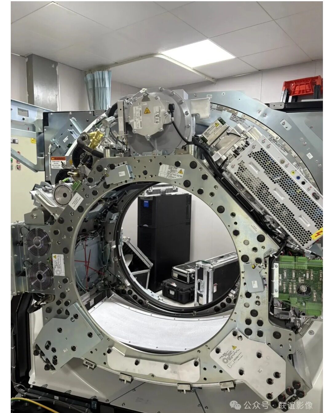• 旋转架(gantry):将X线球管和探测器固定在相对位置(通常呈180°对向排列),并围绕患者进行360°旋转扫描。旋转速度是重要性能指标(如0.3秒/圈),速度越快,扫描时间越短,可减少运动伪影。