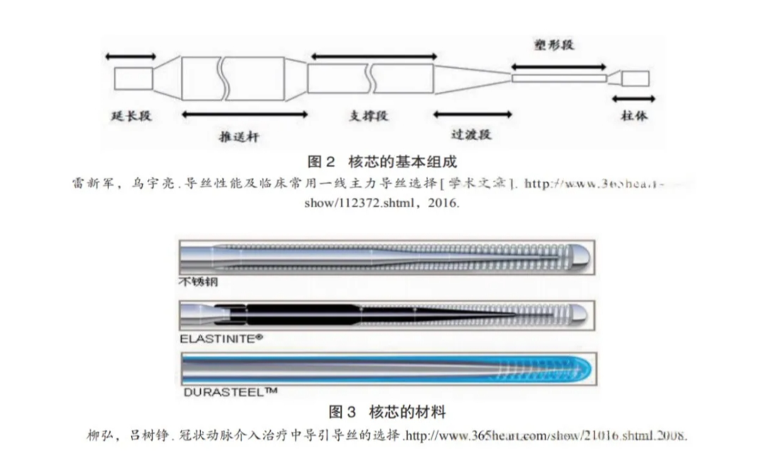 核芯是导丝的基本结构,从功能上可分为三段:塑形段、过渡段(锥形渐细)和支撑段。
