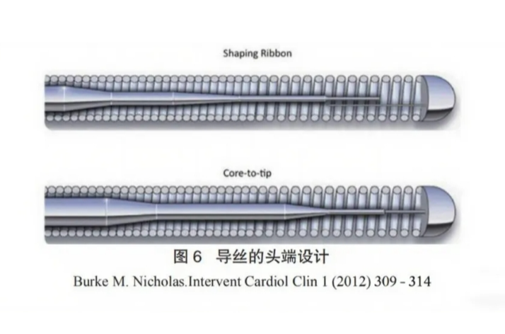 导丝的头端设计是决定导丝头端可控性和柔韧性的决定因素,目前主要有两种方式:核心直达头端(core-to-tip)设计和塑形导丝(Shaping Ribbon)设计:核芯直达头端设计具有较好的触觉反馈、推送性和跟踪性,易于操控且头端硬度强,适用于高阻力病变和穿支架网眼。