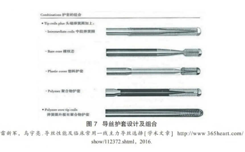 护套设计是导丝操控性和跟踪性的重要因素,且决定导丝的可视性。护套分为弹簧圈护套、塑料护套和聚合物护套。